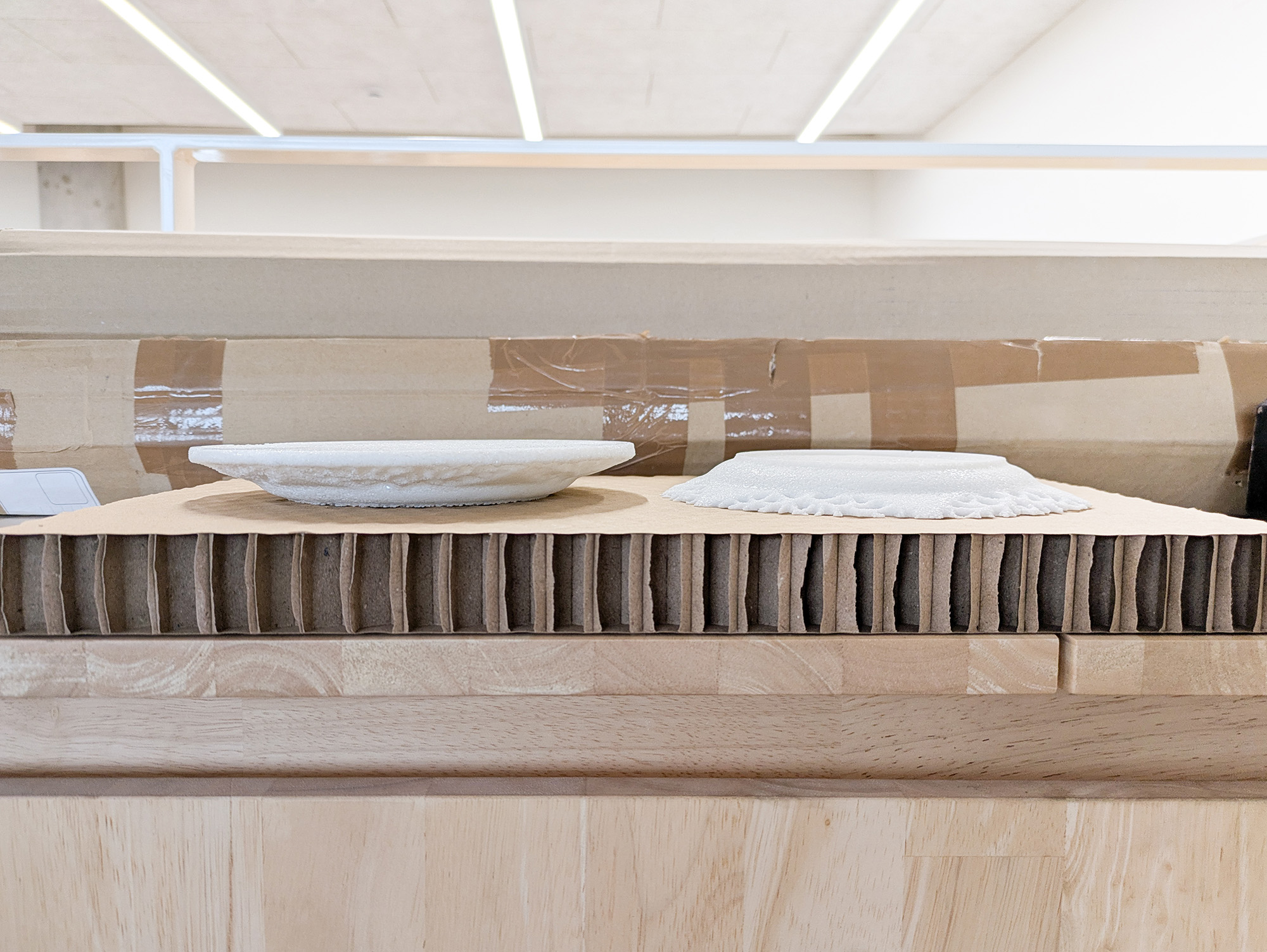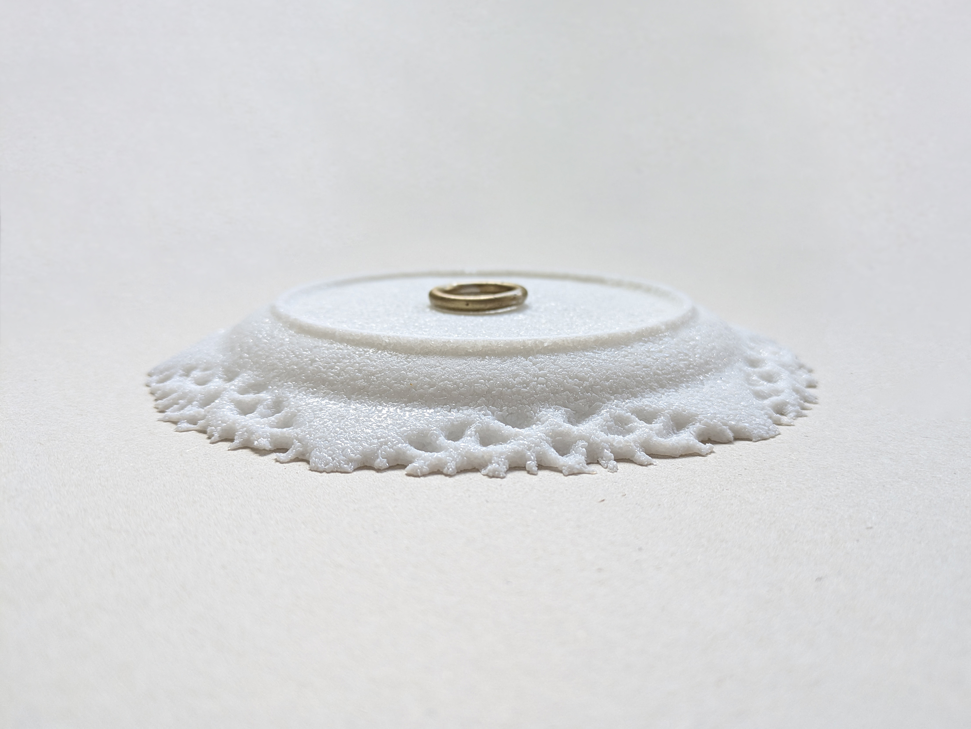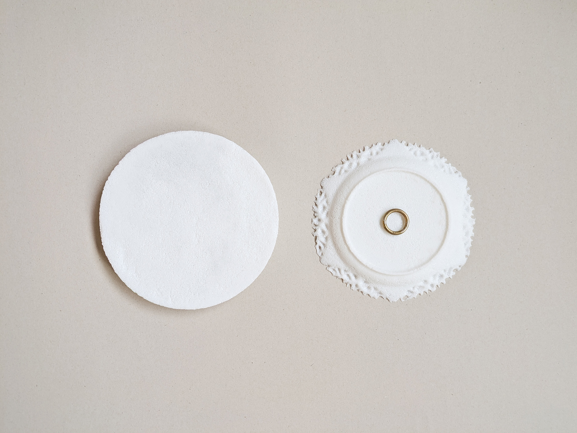 The work looks at the themes of mourning and saying goodbye. Two plates are placed next to each other. They're both based on the same basic shape, inspired by lace motifs and based on historical ceramic tableware. One of the plates is upside down and clearly decayed. It's like a final remnant of what has been lost, lying there like it's on an altar.